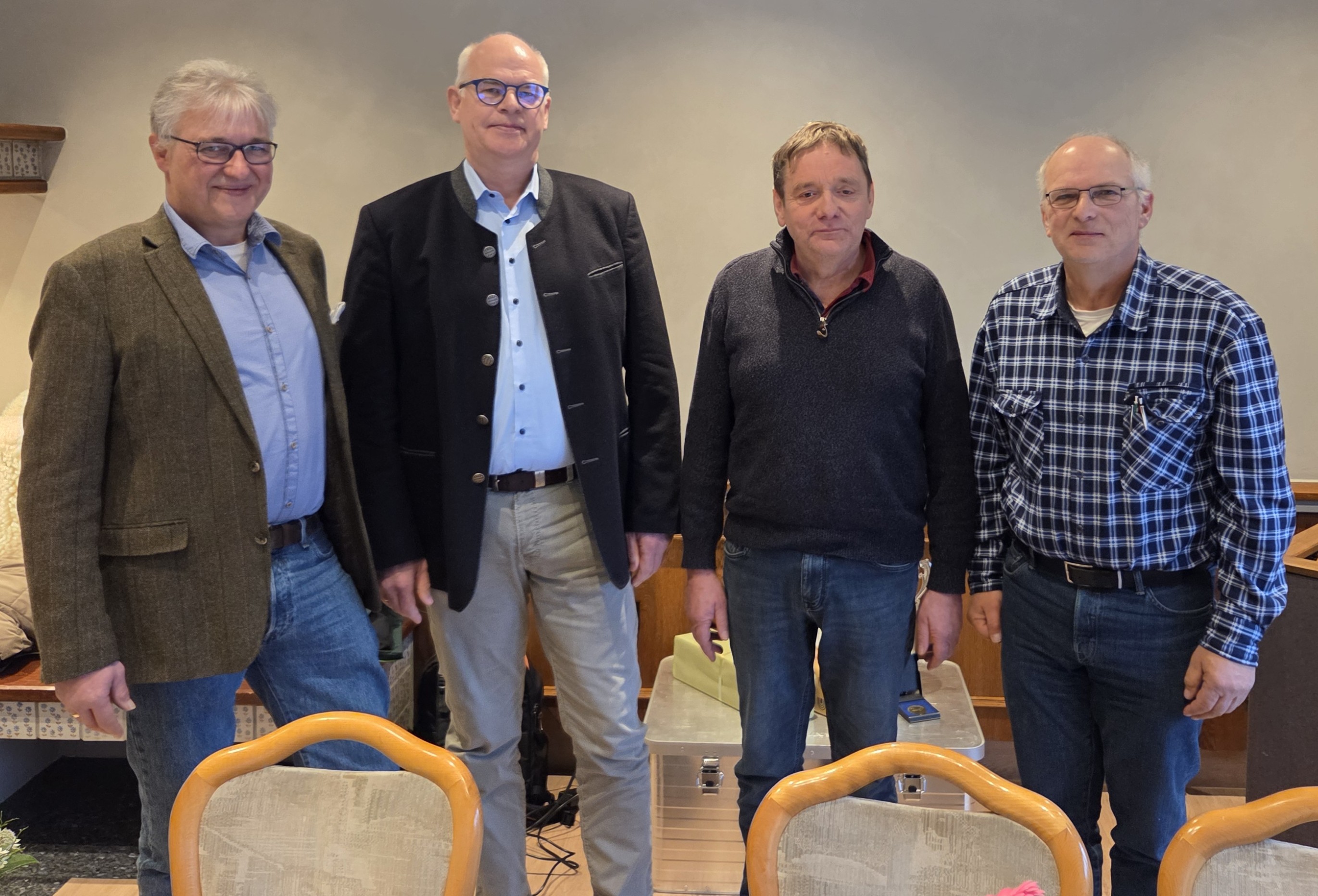 Heinz Heuer (Zweiter von links) aus Schatensen (Landkreis Uelzen) hat 2022 die besten Pflanzkartoffeln in Niedersachsen erzeugt. Zweiter wurde Peter Niemann (Zweiter von rechts). Der Drittplatzierte Henning Mahnkopf fehlt auf dem Foto. Preise und Urkunden wurden von Kammerpräsident Gerhard Schwetje (links) und dem Vorsitzenden der Saatguterzeugergemeinschaft, Helge Johannes, überreicht.